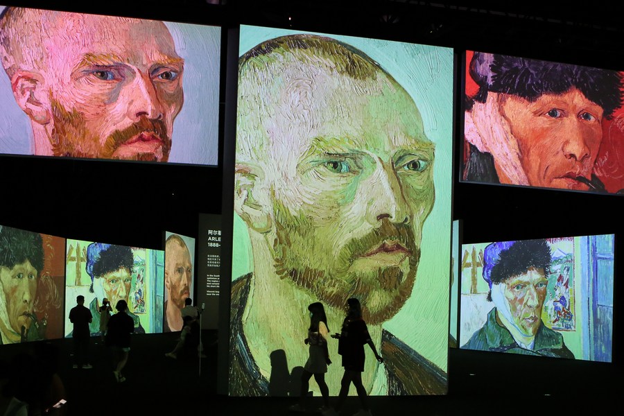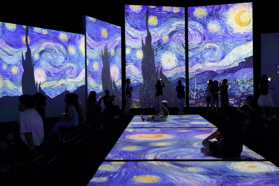 People visit the immersive exhibition "Van Gogh Alive: the experience" at the World Expo Museum at night in Shanghai, east China, July 16, 2023. (Xinhua/Xin Mengchen)