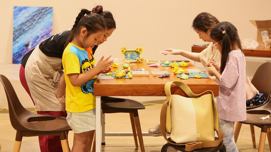 Children make sunflower-themed clay photo frames at the World Expo Museum at night in Shanghai, east China, July 16, 2023. (Xinhua/Xin Mengchen)