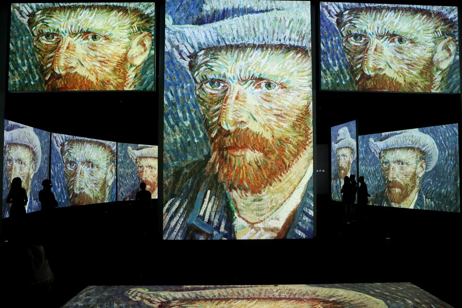 A visitor is seen during the immersive exhibition "Van Gogh Alive: the experience" at the World Expo Museum at night in Shanghai, east China, July 16, 2023. (Xinhua/Xin Mengchen)