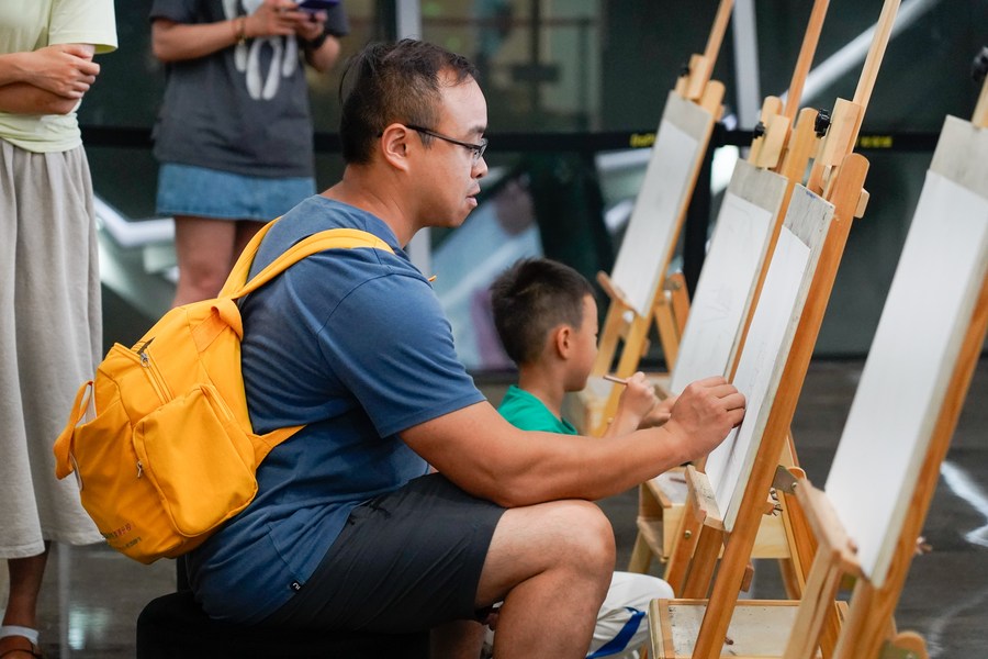 People take part in an interactive painting activity at the World Expo Museum in Shanghai, east China, July 16, 2023. (Photo by Li Xinyi/Xinhua)