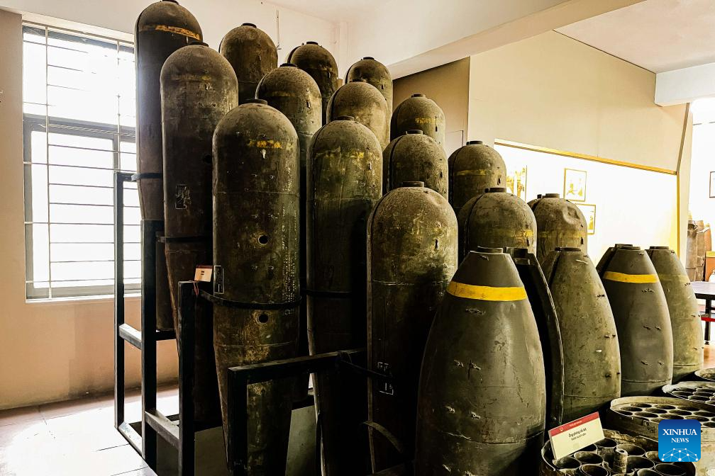 This photo taken on July 14, 2023 shows cluster bomblets left by the U.S. military during the Vietnam war at a museum in Hanoi, Vietnam.(Photo by Pham Dinh Duc/Xinhua)