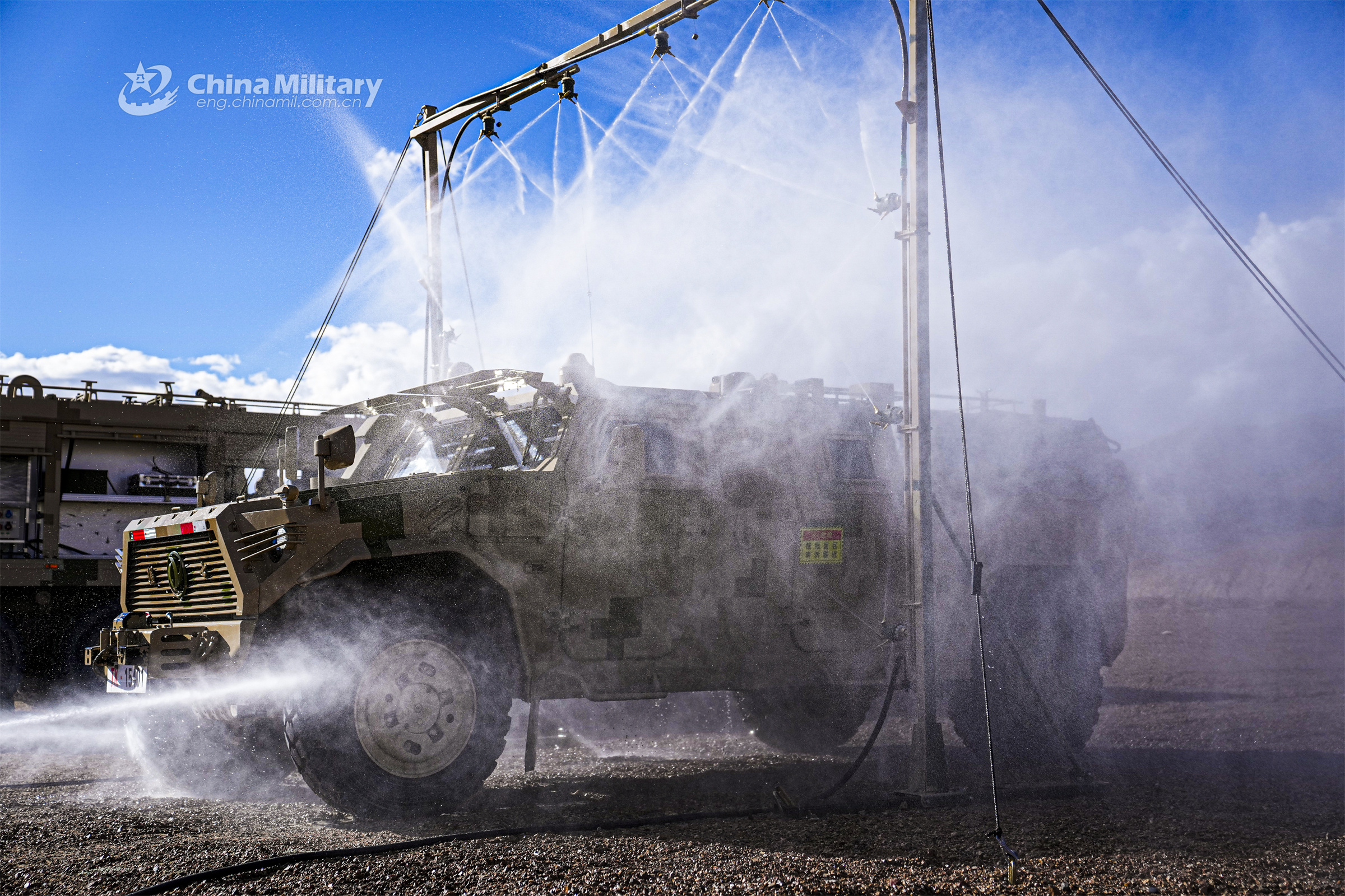 A military vehicle is decontaminated by a pressing washing system during a comprehensive chemical training exercise on July 5, 2023. (eng.chinamil.com.cn/Photo by Feng Chiyu)