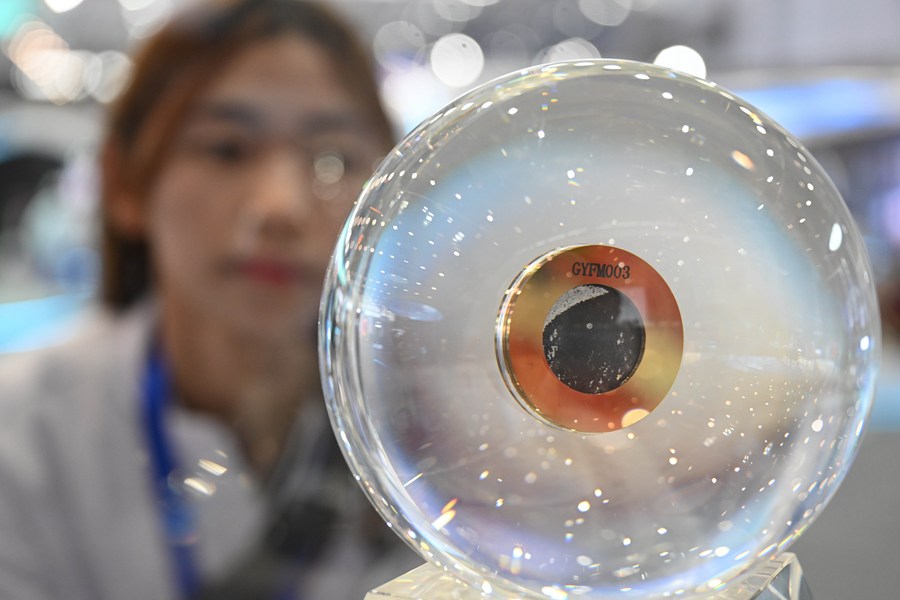 A visitor looks at a lunar soil sample displayed at a Space Day of China science exhibition in Hefei, east China's Anhui Province, April 24, 2023. (Xinhua/Huang Bohan)