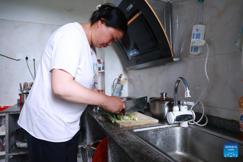 Long Rumei, a relocated resident, cooks at her residence in Baiyanglin sub-district in Bijie City of southwest China's Guizhou Province, July 13, 2023. Baiyanglin sub-district, home to nearly 30,000 residents, is the largest single relocation site for poverty alleviation in Guizhou. In addition to mobilizing all possible resources to improve employment and income for the residents, local authorities managed to build and operate a number of schools, kindergartens, day care centers, and clinics for the young, the aged, and the ailing ones. (Xinhua/Liu Xu)