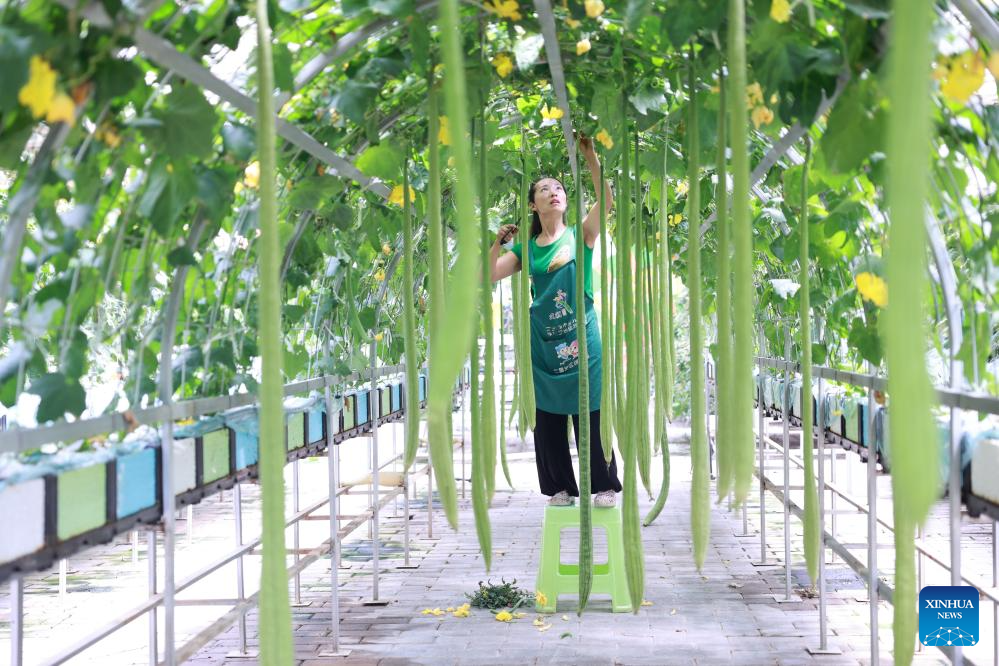 A relocated resident works at an ecological agriculture park in Baiyanglin sub-district in Bijie City of southwest China's Guizhou Province, July 13, 2023. Baiyanglin sub-district, home to nearly 30,000 residents, is the largest single relocation site for poverty alleviation in Guizhou. In addition to mobilizing all possible resources to improve employment and income for the residents, local authorities managed to build and operate a number of schools, kindergartens, day care centers, and clinics for the young, the aged, and the ailing ones. (Xinhua/Liu Xu)