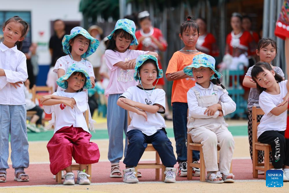 Children perform at a kindergarten in Baiyanglin sub-district in Bijie City of southwest China's Guizhou Province, July 13, 2023. Baiyanglin sub-district, home to nearly 30,000 residents, is the largest single relocation site for poverty alleviation in Guizhou. In addition to mobilizing all possible resources to improve employment and income for the residents, local authorities managed to build and operate a number of schools, kindergartens, day care centers, and clinics for the young, the aged, and the ailing ones. (Xinhua/Liu Xu)