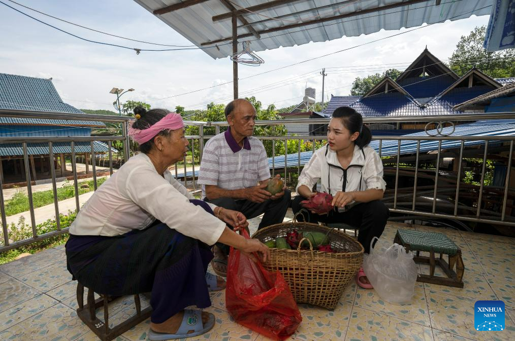 Yi Bofeng (R) talks with her grandparents in Mengla County, southwest China's Yunnan Province, July 16, 2023. (Xinhua/Fei Maohua)