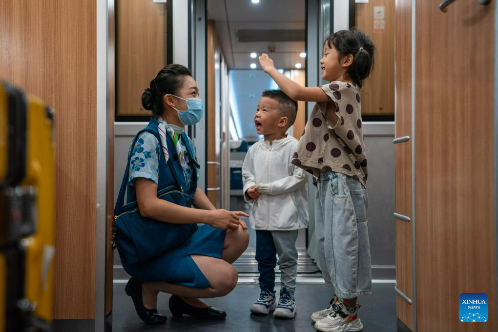 Yi Bofeng (C) serves passengers aboard the train D887 on July 16, 2023. (Xinhua/Chen Xinbo)