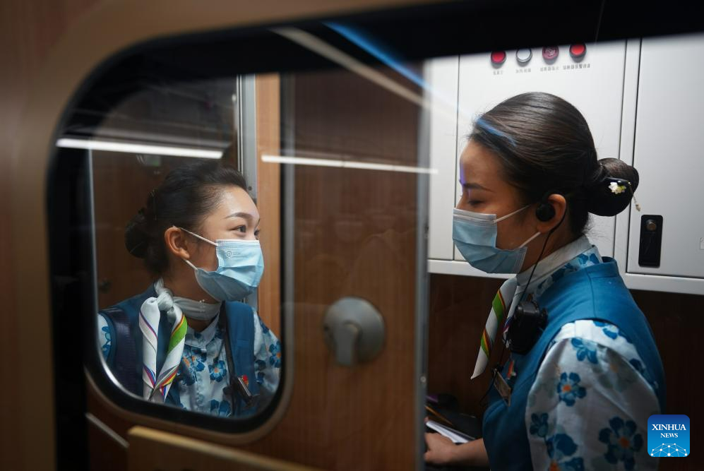 Yi Bofeng (L) talks with her colleague aboard the train D887 on July 16, 2023. (Xinhua/Chen Xinbo)