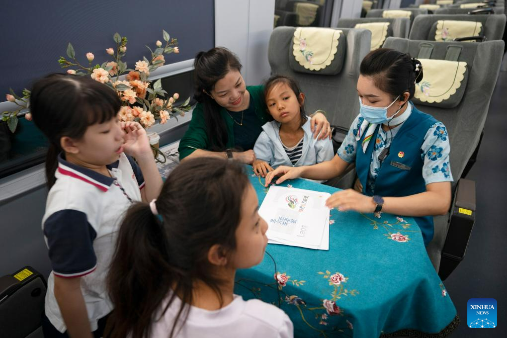 Yi Bofeng (1st L) interacts with passengers aboard the train D887 on July 16, 2023. (Xinhua/Chen Xinbo)