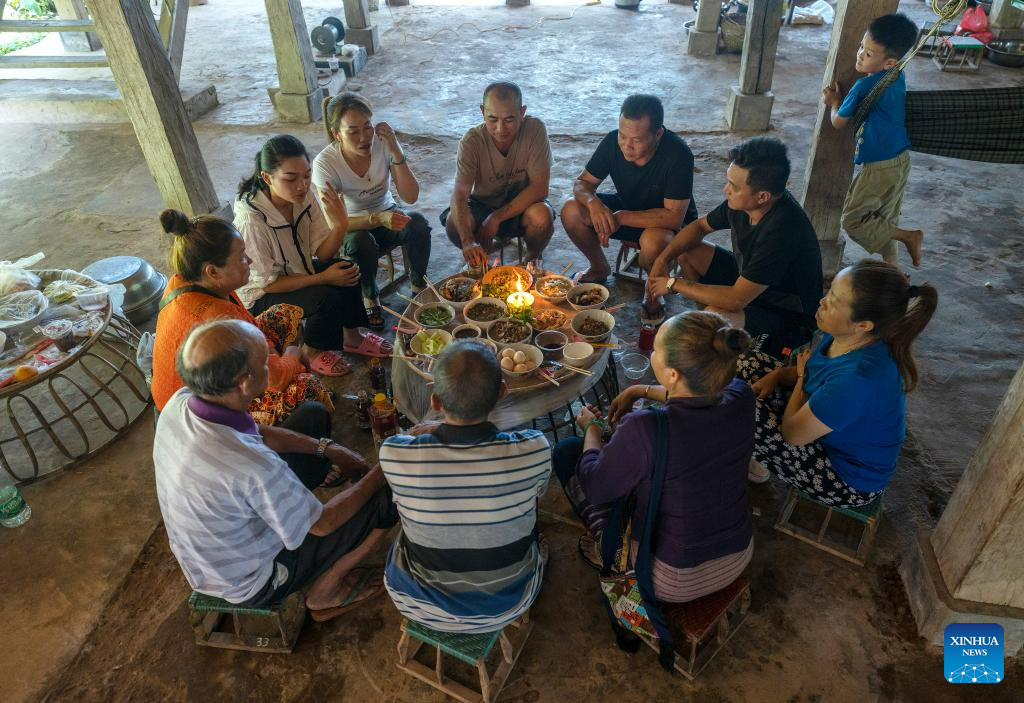 Yi Bofeng (3rd L) has lunch with her family in Mengla County, southwest China's Yunnan Province, July 16, 2023. (Xinhua/Fei Maohua)