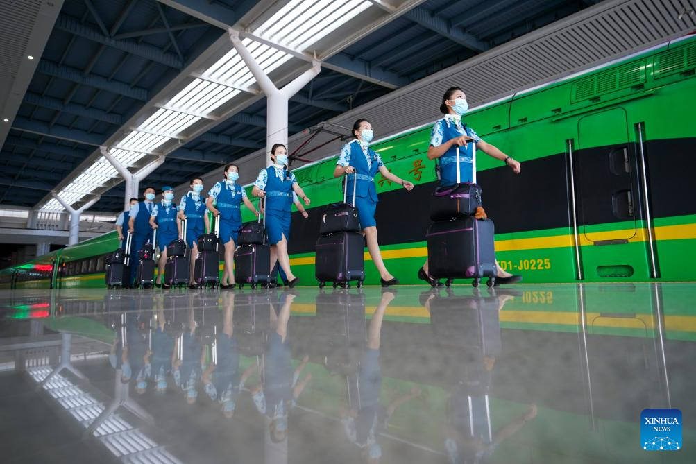 Yi Bofeng (1st R) and her colleagues prepare to board the train D887 at Kunming South Railway Station in Kunming, southwest China's Yunnan Province, July 16, 2023. (Xinhua/Chen Xinbo)