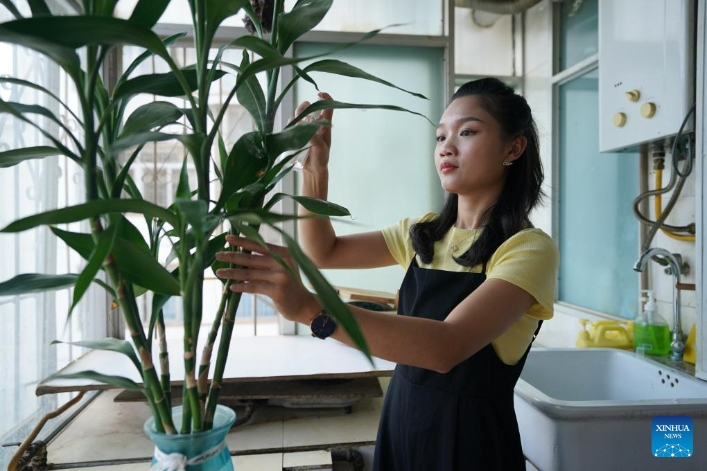 Yi Bofeng tends a plant at home in Kunming, southwest China's Yunnan Province, July 15, 2023. (Xinhua/Chen Xinbo)