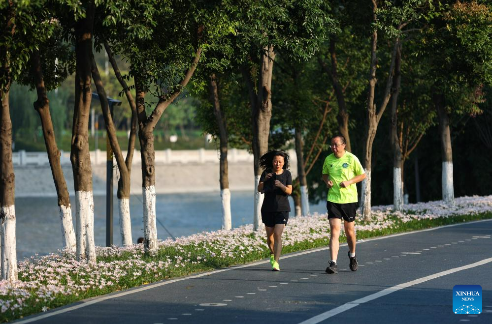 People jog at Tianfu Greenway in Chengdu, capital of southwest China's Sichuan Province, July 16, 2023. The 31st International University Sports Federation (FISU) Summer World University Games will be held in Chengdu from July 28 to August 8. (Xinhua/Xu Bingjie)