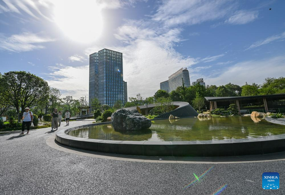 People walk in a park in Chengdu, capital of southwest China's Sichuan Province, July 14, 2023. The 31st International University Sports Federation (FISU) Summer World University Games will be held in Chengdu from July 28 to August 8. (Xinhua/Wang Xi)