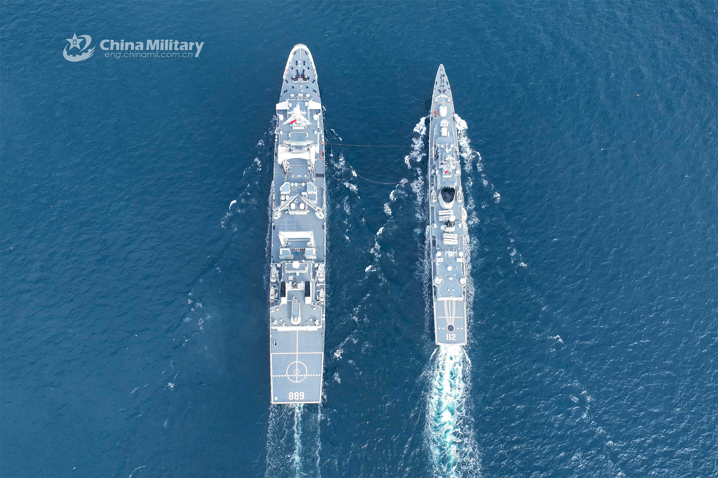 Warships attached to a combat support ship flotilla of the navy under the PLA Northern Theater Command steam in formation to conduct alongside replenishment-at-sea during a recent comprehensive replenishment training exercise. (eng.chinamil.com.cn/Photo by Xu Taotao)