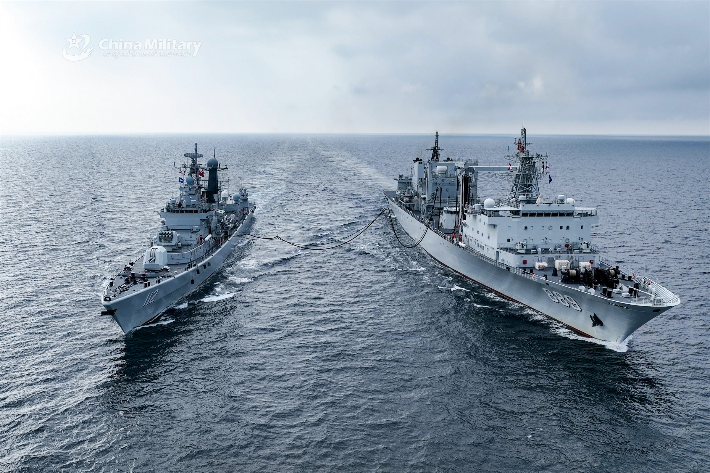 Warships attached to a combat support ship flotilla of the navy under the PLA Northern Theater Command steam in formation to conduct alongside replenishment-at-sea during a recent comprehensive replenishment training exercise. (eng.chinamil.com.cn/Photo by Xu Taotao)