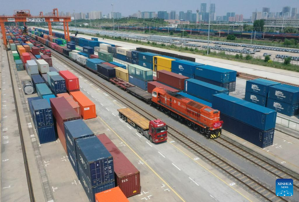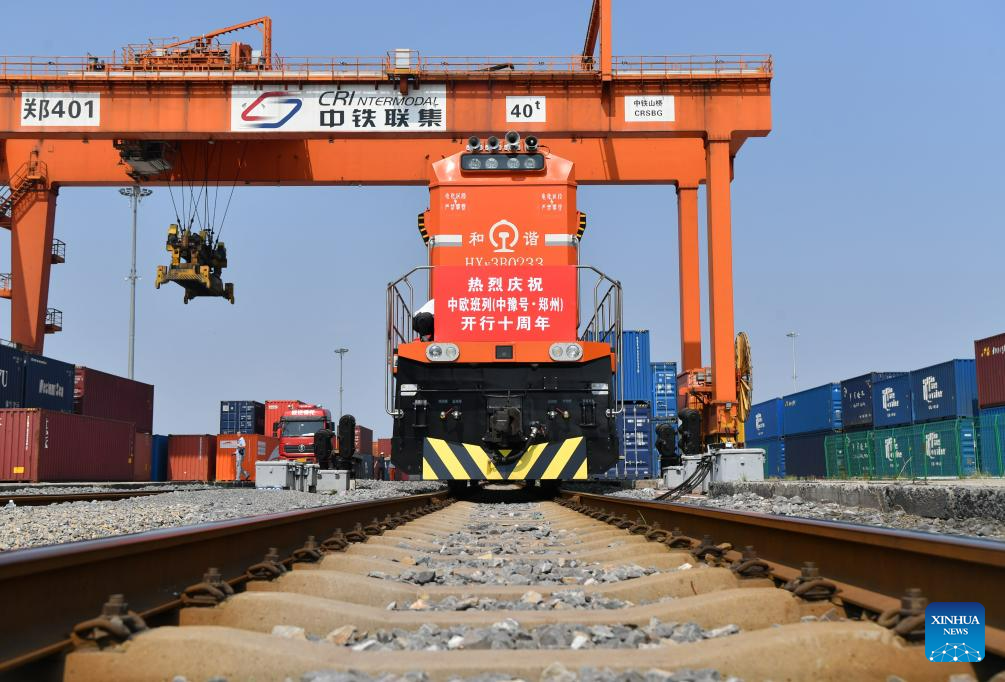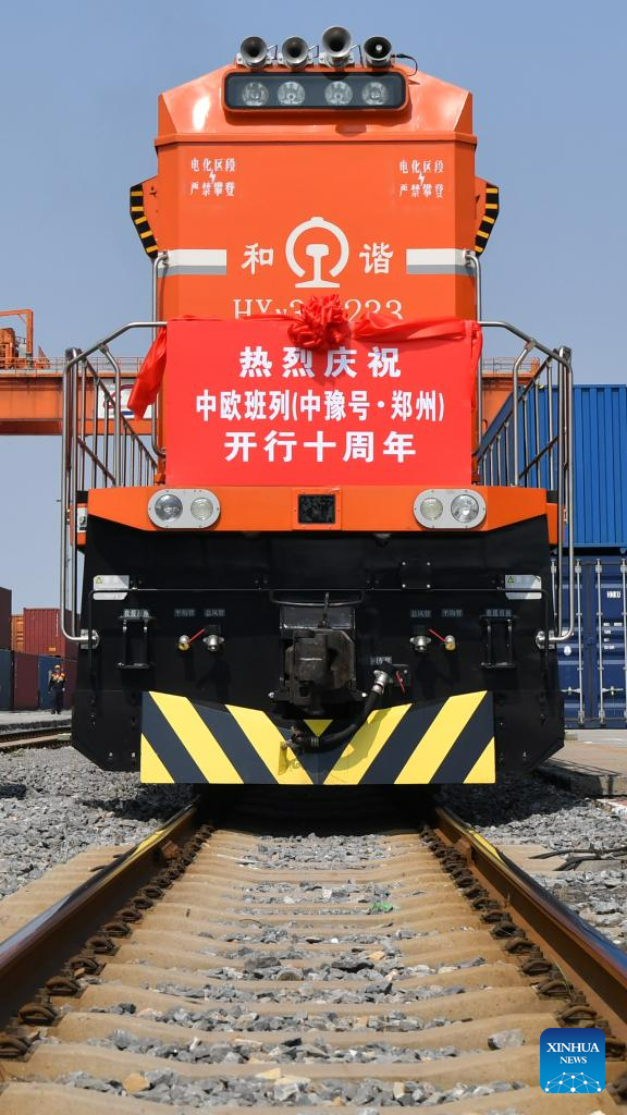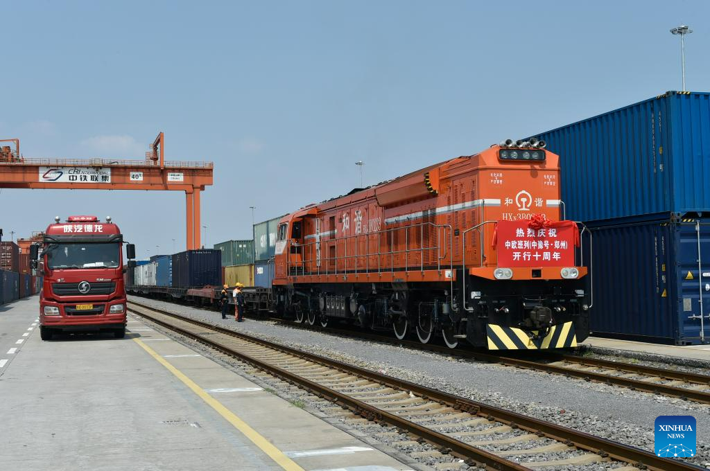 A China-Europe freight train bound for Hamburg, Germany waits for departure at Putian Station in Zhengzhou, capital of central China's Henan Province, July 18, 2023. Zhengzhou has handled 7,572 China-Europe freight trains which have carried 670,000 twenty-foot equivalent units (TEUs) of cargo since July 18, 2013. (Xinhua/Li Jianan)