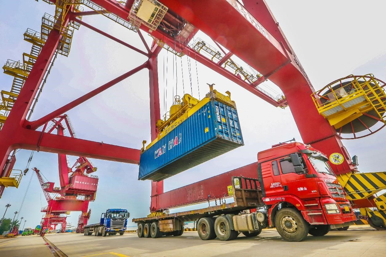Containers are unloaded from trucks at the Zhengpu port in Ma'anshan, east China's Anhui province, July 3. (People's Daily Online/Wang Wensheng)