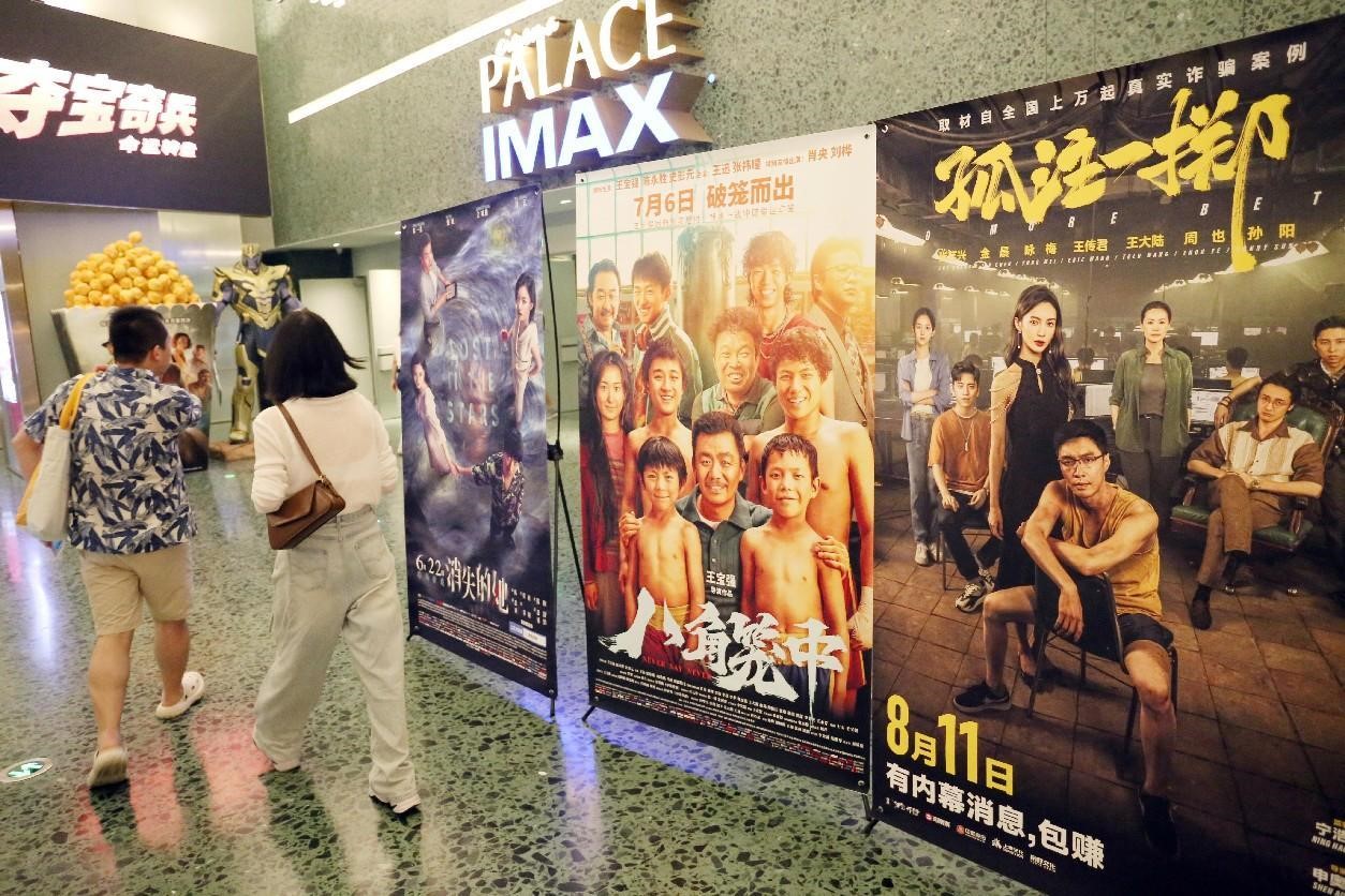 Photo taken on July 15, 2023 shows posters in a cinema in Shanghai. So far, China's box office revenue for the summer movie season has exceeded 8 billion yuan ($1.11 billion). (People's Daily Online/Chen Yuyu)