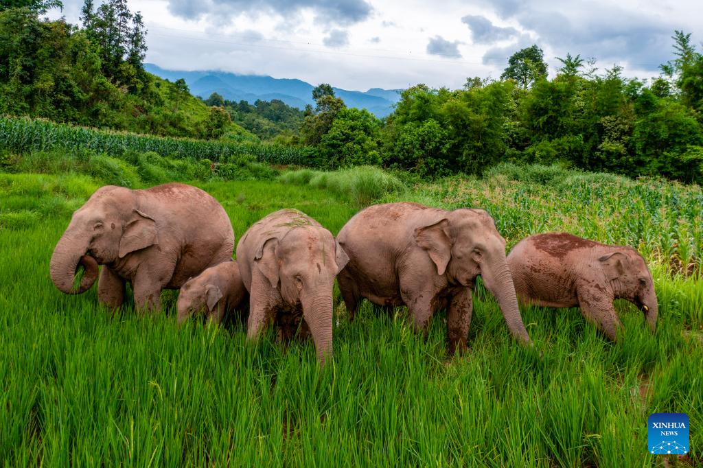 Asian elephants eat in rice fields in Jiangcheng Hani and Yi Autonomous County of Pu'er, southwest China's Yunnan Province, July 19, 2023. (Xinhua/Fei Maohua)