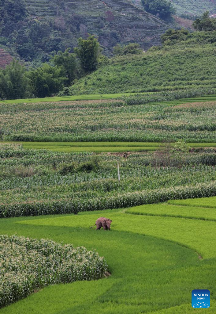 An Asian elephant eats in rice and corn fields in Jiangcheng Hani and Yi Autonomous County of Pu'er, southwest China's Yunnan Province, July 19, 2023. (Xinhua/Cui Wen)