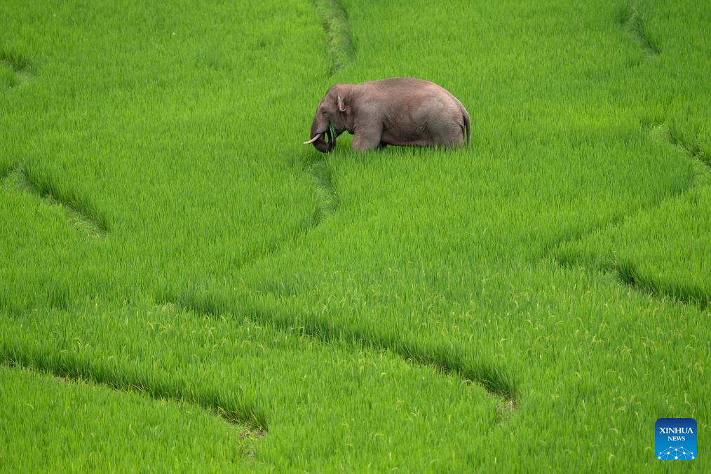 An Asian elephant eats in rice fields in Jiangcheng Hani and Yi Autonomous County of Pu'er, southwest China's Yunnan Province, July 19, 2023. (Xinhua/Fei Maohua)