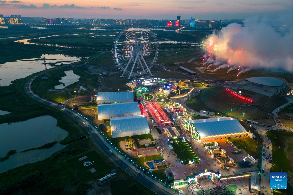 The aerial photo taken on July 20, 2023 shows a view of the 21th China Harbin International Beer Festival in Harbin, capital of northeast China's Heilongjiang Province. The 21th China Harbin International Beer Festival opened here on Thursday. (Xinhua/Zhang Tao)