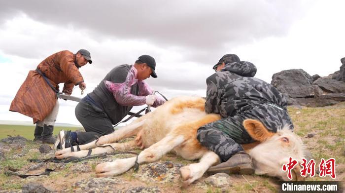 Gangsulede, a young herdsman born after 1990, and others assist a cow in calving in Abaga Banner, Xilingol League, north China's Inner Mongolia Autonomous Region. (Chinanews.com/Cui Boqun)