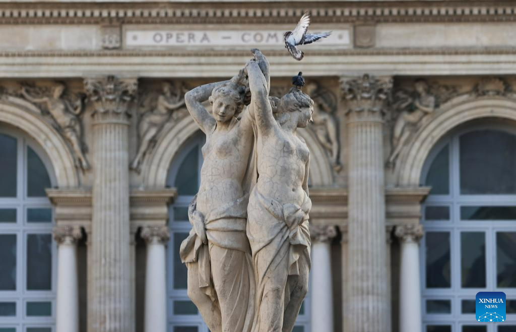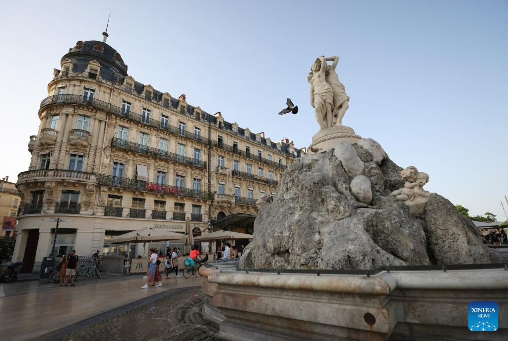 This photo taken on July 17, 2023 shows the Fountain of the Three Graces at Place de la Comedie in Montpellier, France.