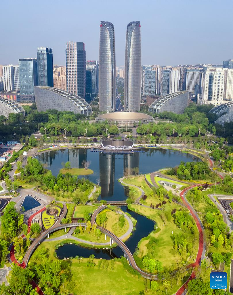 This aerial photo taken on April 21, 2021 shows a view of Jiaozi park and a financial center in Chengdu, southwest China's Sichuan Province.