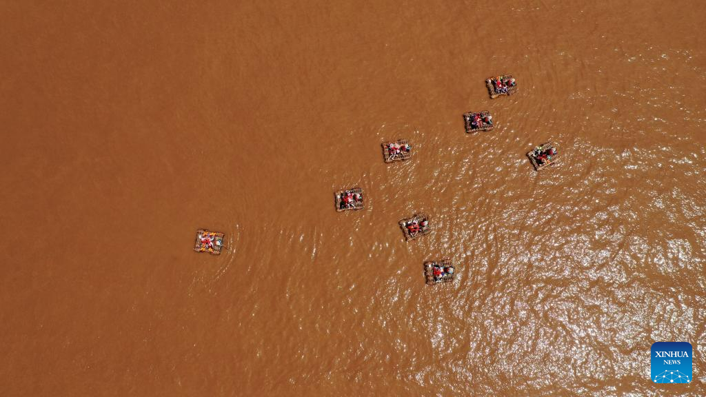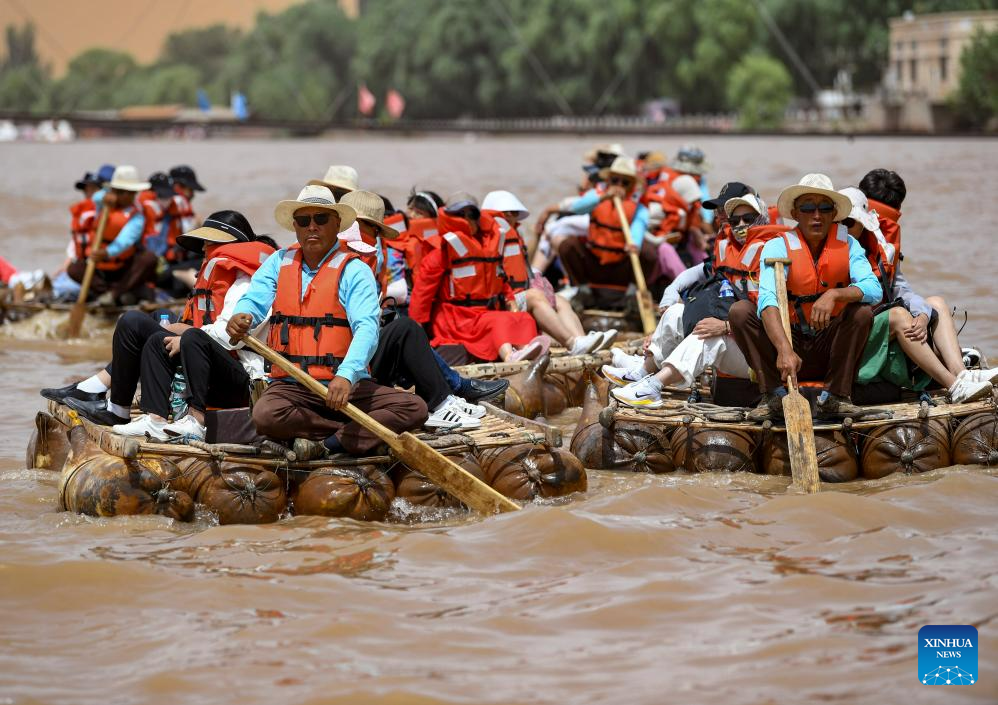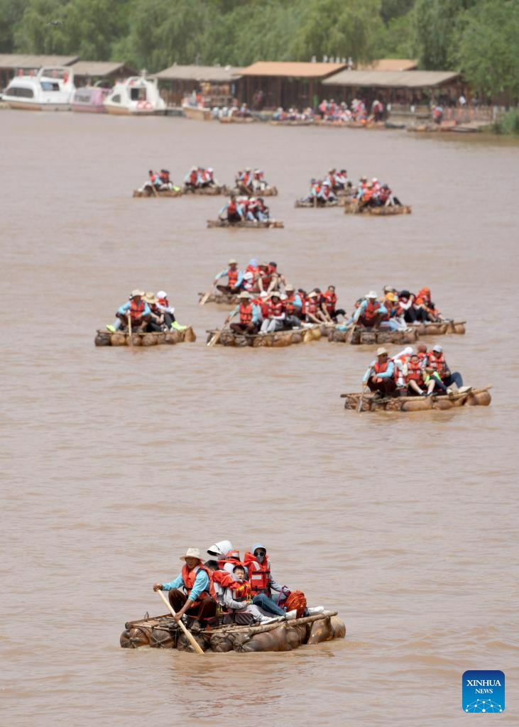 Visitors take sheepskin rafts at the Shapotou scenic spot in Zhongwei, northwest China's Ningxia Hui Autonomous Region, July 20, 2023. Shapotou scenic spot in Zhongwei of northwest China's Ningxia has entered its peak tourism season during the summer vacation, with the largest daily visitor flow reaching over 10,000. (Xinhua/Feng Kaihua)
