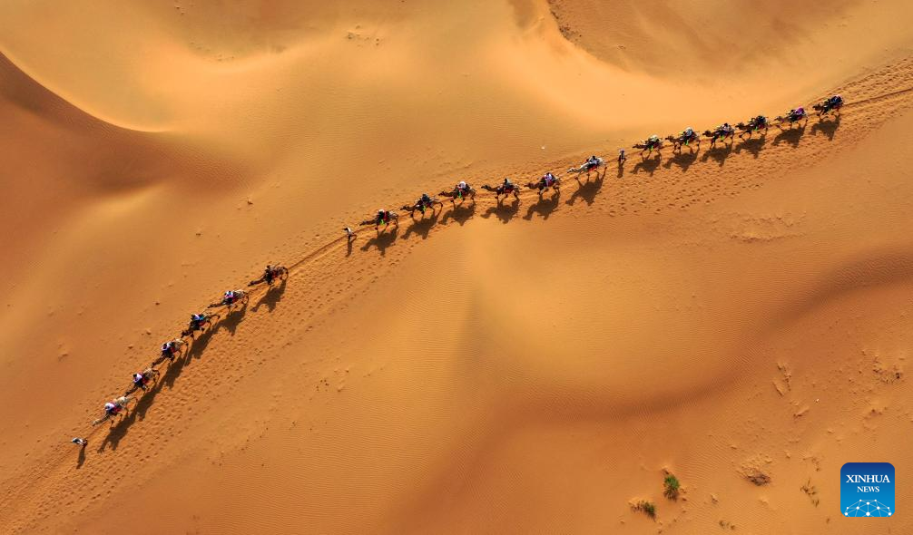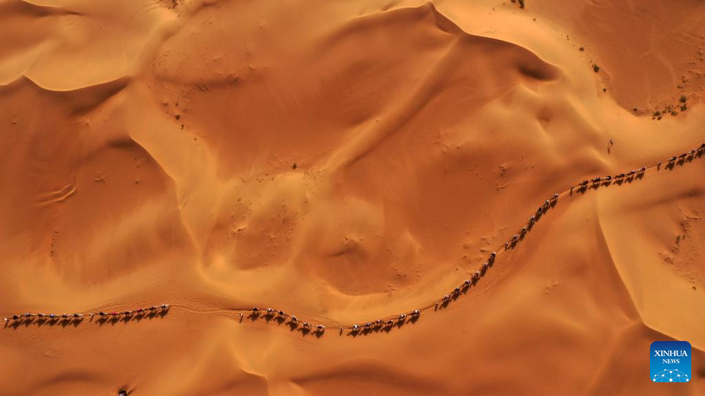 This aerial photo taken on July 20, 2023 shows visitors riding camels at the Shapotou scenic spot in Zhongwei, northwest China's Ningxia Hui Autonomous Region. Shapotou scenic spot in Zhongwei of northwest China's Ningxia has entered its peak tourism season during the summer vacation, with the largest daily visitor flow reaching over 10,000. (Xinhua/Wang Peng)