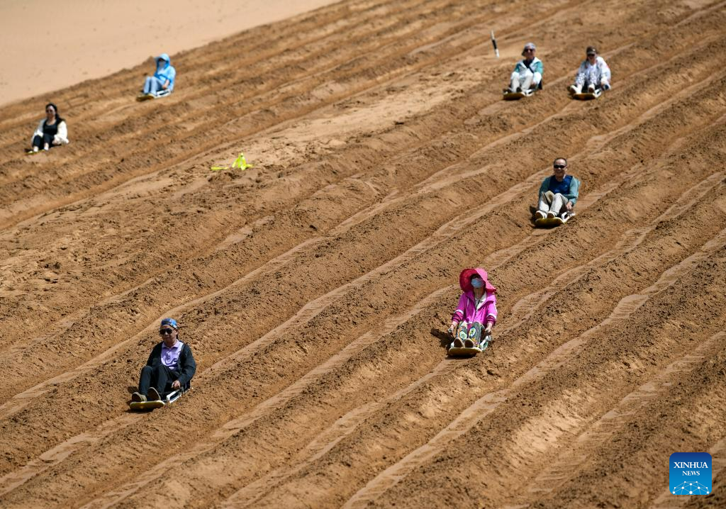Visitors experience sand sliding at the Shapotou scenic spot in Zhongwei, northwest China's Ningxia Hui Autonomous Region, July 20, 2023. Shapotou scenic spot in Zhongwei of northwest China's Ningxia has entered its peak tourism season during the summer vacation, with the largest daily visitor flow reaching over 10,000. (Xinhua/Feng Kaihua)