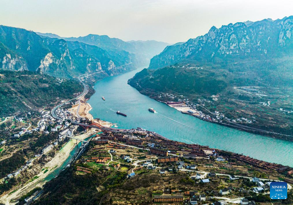 This aerial photo taken on March 29, 2023 shows the scenery of Xiling Gorge, one of the Three Gorges on the Yangtze River, in central China's Hubei Province. Located in the upper reaches of the Yangtze River, the Three Gorges Reservoir area is an important ecological function zone and reservoir of freshwater resources in China.