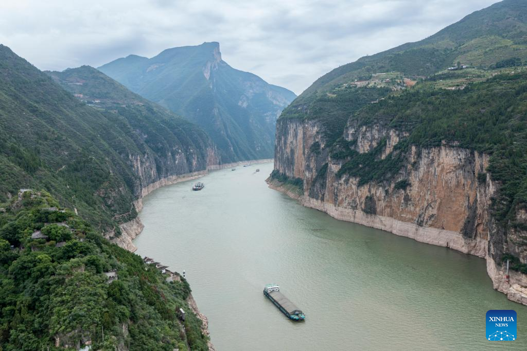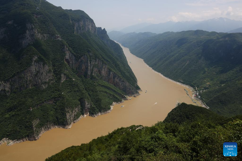 This photo taken on July 1, 2023 shows the scenery of Qutang Gorge, one of the Three Gorges on the Yangtze River, in southwest China's Chongqing Municipality. Located in the upper reaches of the Yangtze River, the Three Gorges Reservoir area is an important ecological function zone and reservoir of freshwater resources in China.