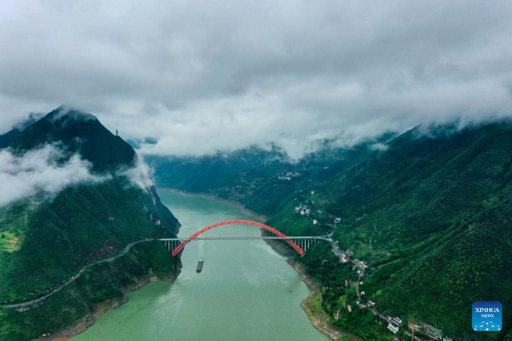 This aerial photo taken on June 27, 2023 shows the Wushan Yangtze River Bridge at Wuxia Gorge, one of the Three Gorges on the Yangtze River, in southwest China's Chongqing Municipality. Located in the upper reaches of the Yangtze River, the Three Gorges Reservoir area is an important ecological function zone and reservoir of freshwater resources in China.