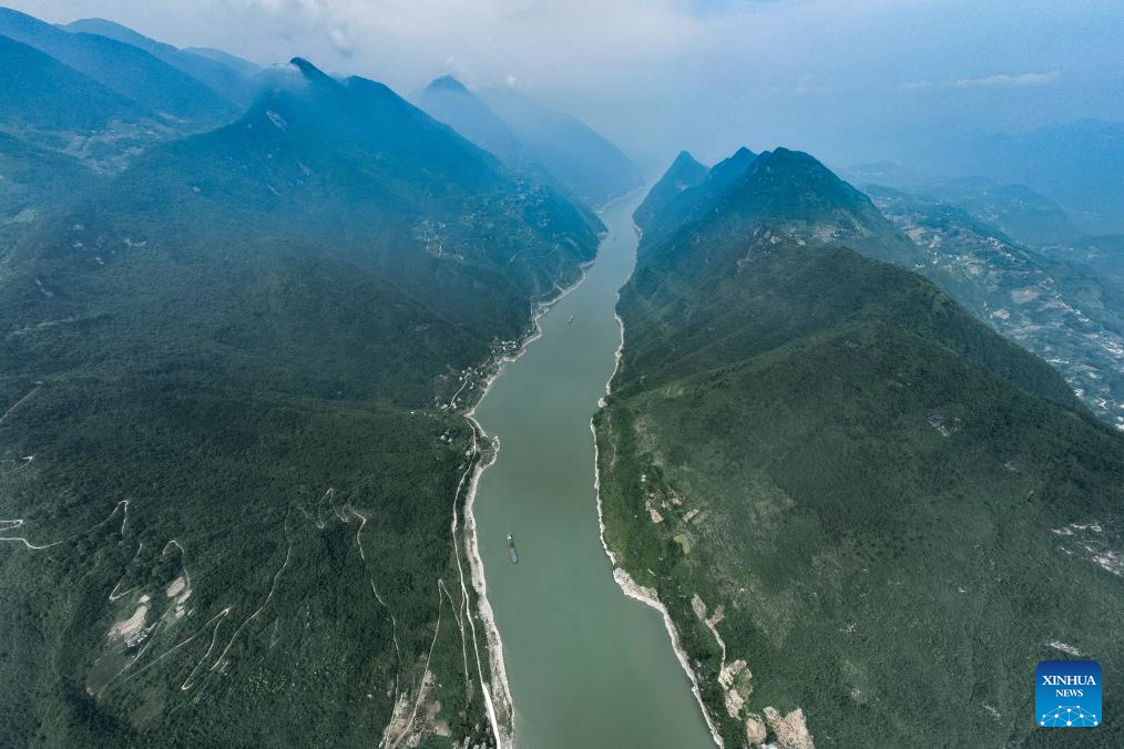 This aerial photo taken on July 1, 2023 shows the scenery of Qutang Gorge, one of the Three Gorges on the Yangtze River, in southwest China's Chongqing Municipality. Located in the upper reaches of the Yangtze River, the Three Gorges Reservoir area is an important ecological function zone and reservoir of freshwater resources in China.