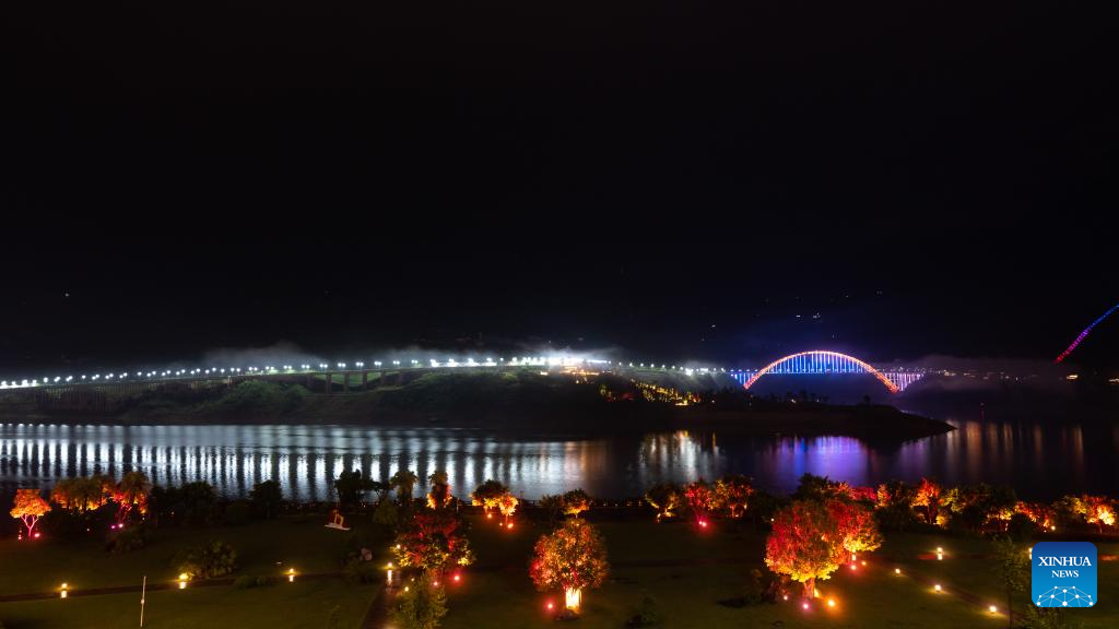 This aerial photo taken on July 6, 2023 shows a night view of Wuxia Gorge, one of the Three Gorges on the Yangtze River, in southwest China's Chongqing Municipality. Located in the upper reaches of the Yangtze River, the Three Gorges Reservoir area is an important ecological function zone and reservoir of freshwater resources in China.