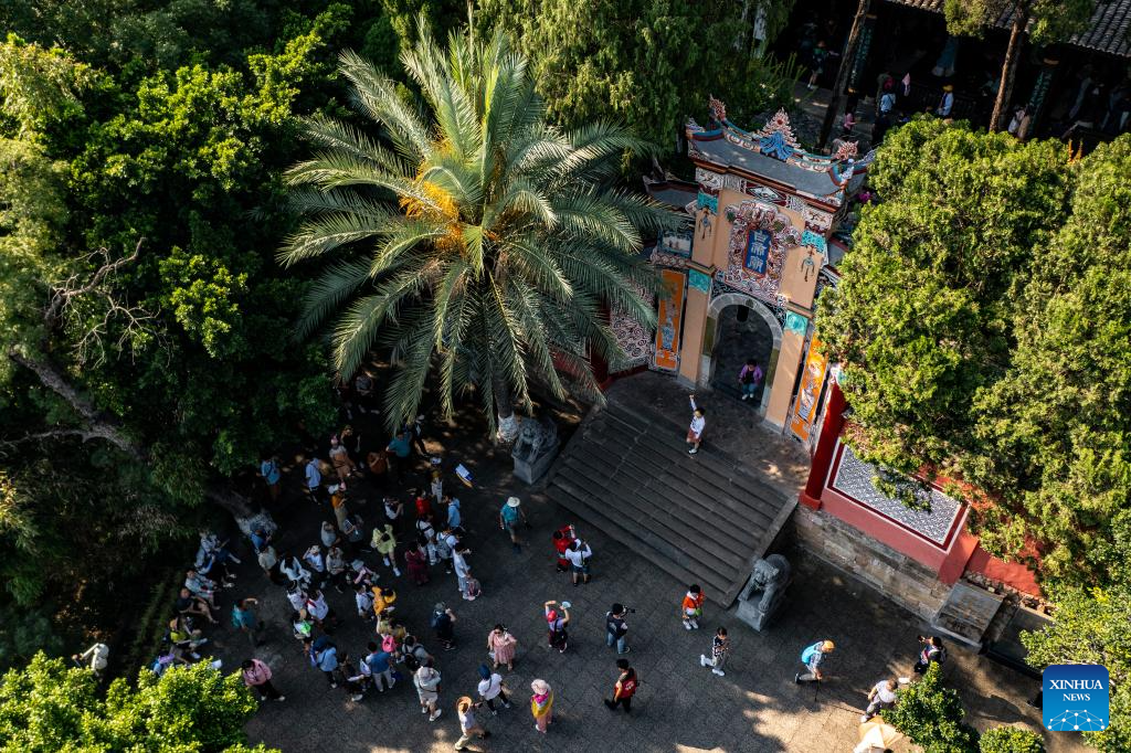 This aerial photo taken on June 25, 2023 shows tourists visiting Baidicheng, a popular tourist attraction sitting on the top of Baidi Mountain in Fengjie County, southwest China's Chongqing Municipality, which marks the front end of Qutang Gorge, one of the Three Gorges on the Yangtze River. Located in the upper reaches of the Yangtze River, the Three Gorges Reservoir area is an important ecological function zone and reservoir of freshwater resources in China.