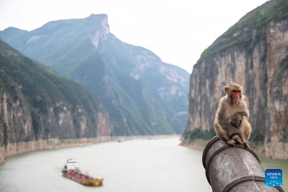 This photo taken on July 1, 2023 shows a monkey at Qutang Gorge, one of the Three Gorges on the Yangtze River, in southwest China's Chongqing Municipality. Located in the upper reaches of the Yangtze River, the Three Gorges Reservoir area is an important ecological function zone and reservoir of freshwater resources in China.