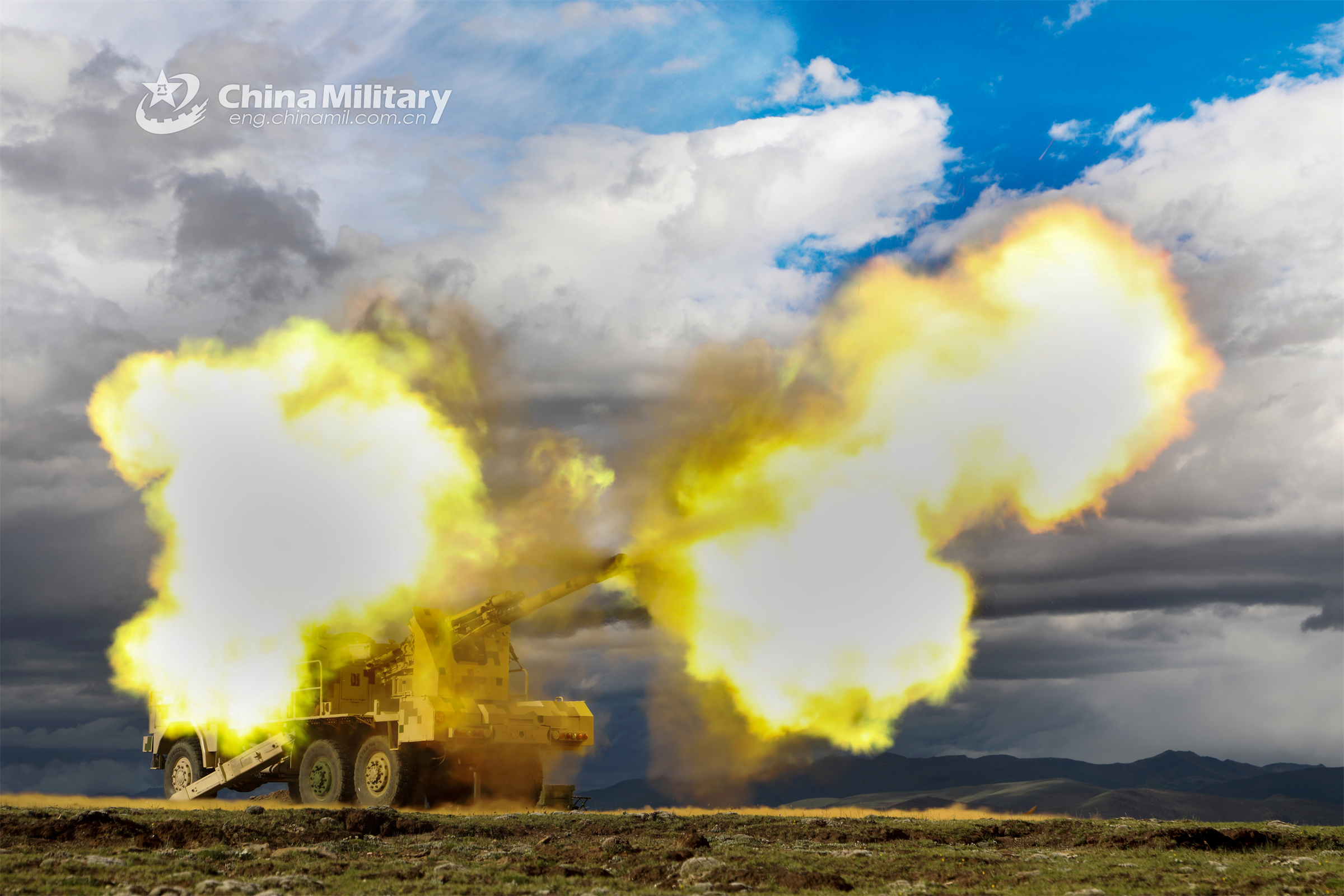 A vehicle-mounted howitzer attached to the PLA 77th Group Army fires at mock target during a live-fire shooting assessment on July 11, 2023. (eng.chinamil.com.cn/Photo by Zhang Mingzhiyang)