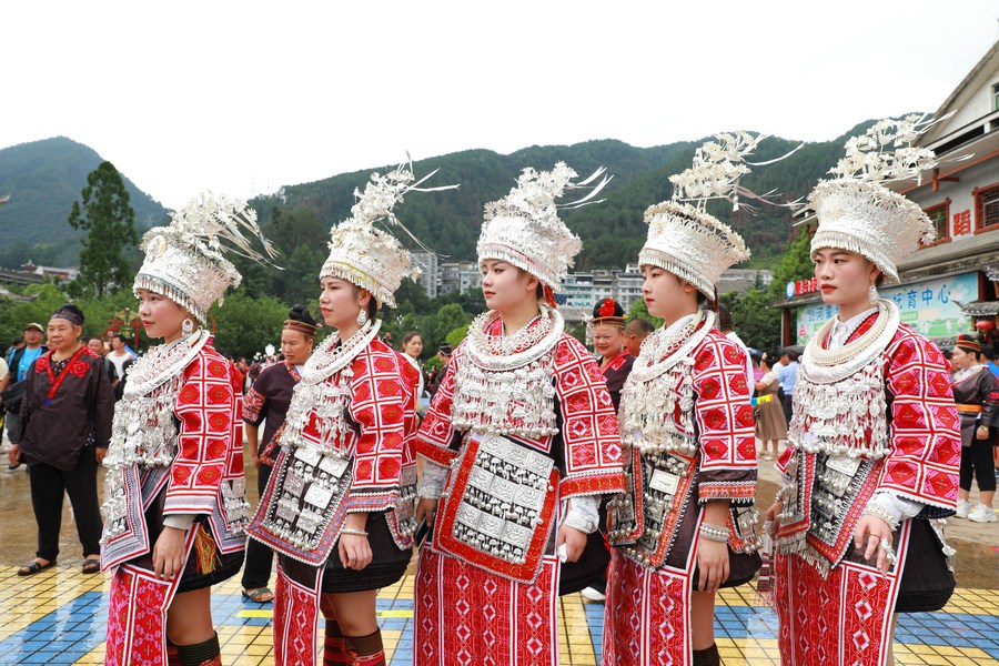 People of Miao ethnic group take part in the celebration of "Liuyueliu", an ethnic festival, in Jianhe County of Qiandongnan Miao and Dong Autonomous Prefecture, southwest China's Guizhou Province, July 23, 2023. (Xinhua/Yang Wenbin)