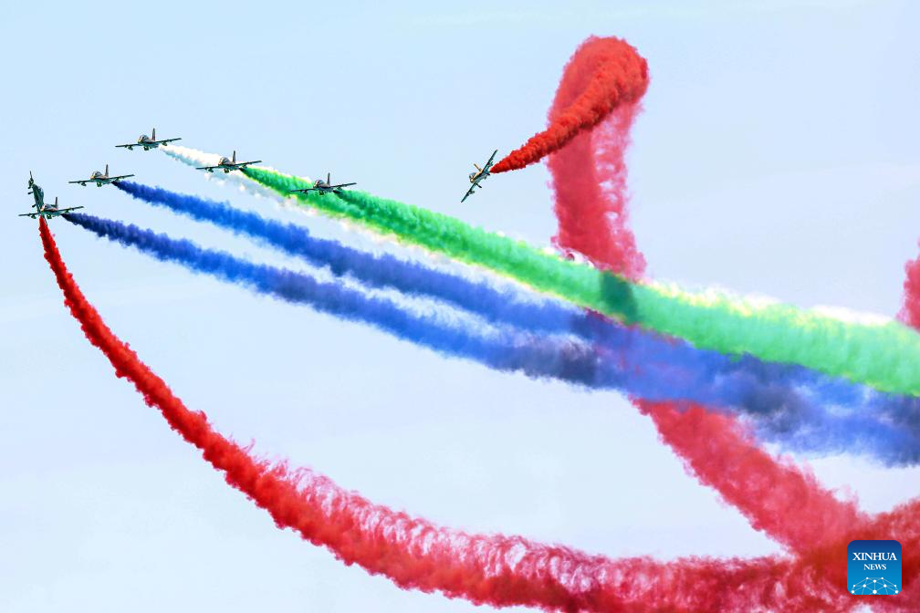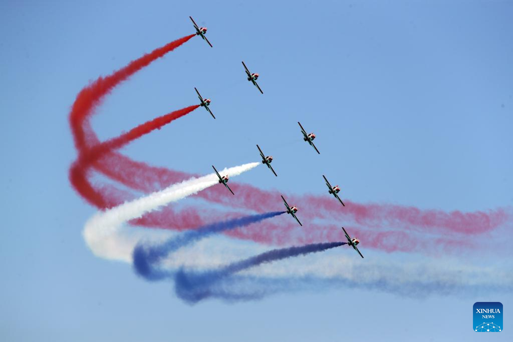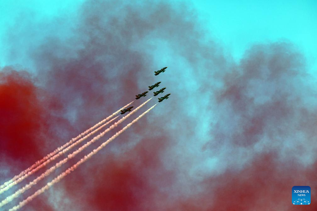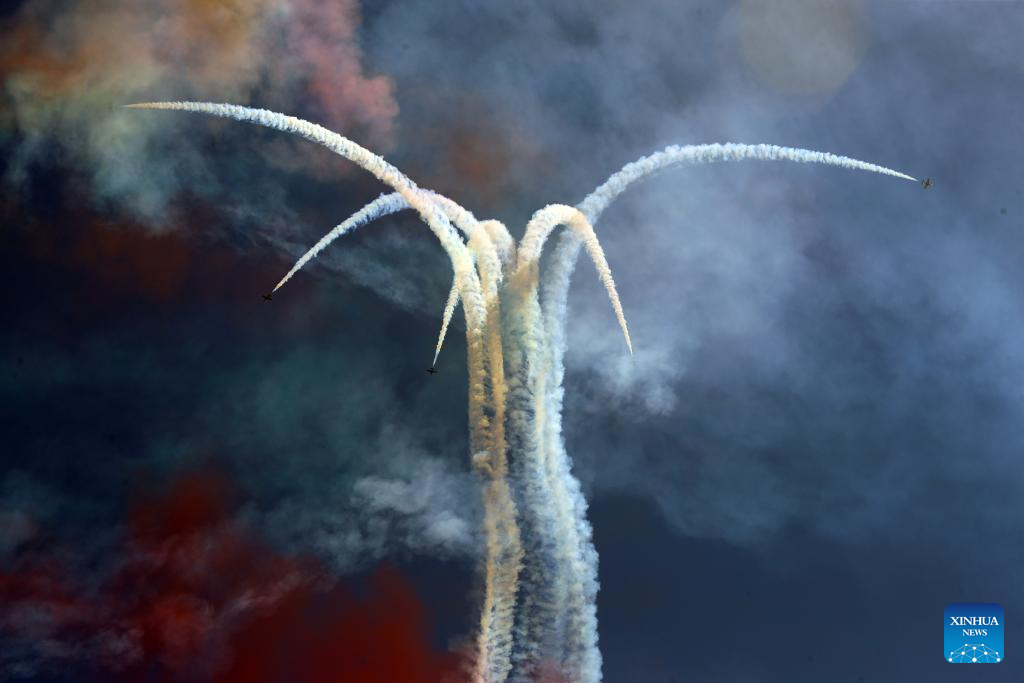 Aircrafts perform aerobatics during the El-Alamein Air Show 2023 in the New Alamein City, Egypt, July 23, 2023. Aircrafts from Egypt and the United Arab Emirates (UAE) on Sunday jointly staged the El-Alamein Air Show 2023 at the Mediterranean coastal city of New Alamein. (Xinhua/Ahmed Gomaa)