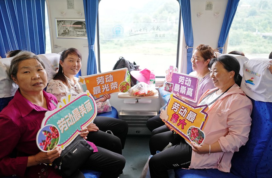 Farmers take a special train to Fengxian county, Baoji city, northwest China's Shaanxi Province, to pick Sichuan peppers to increase their income. (Photo/Chen Zhe)
