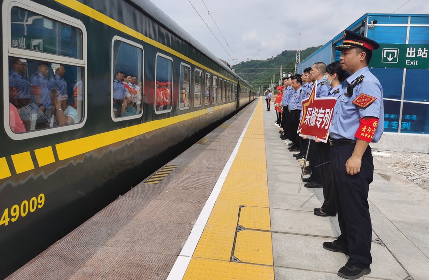 A special train carrying passengers heading to Fengxian county, Baoji city, northwest China's Shaanxi Province to pick Sichuan peppers as a means to increase their income, departs from Yangpingguan township, Ningqiang county, Shaanxi Province. (Photo/Chen Zhe)