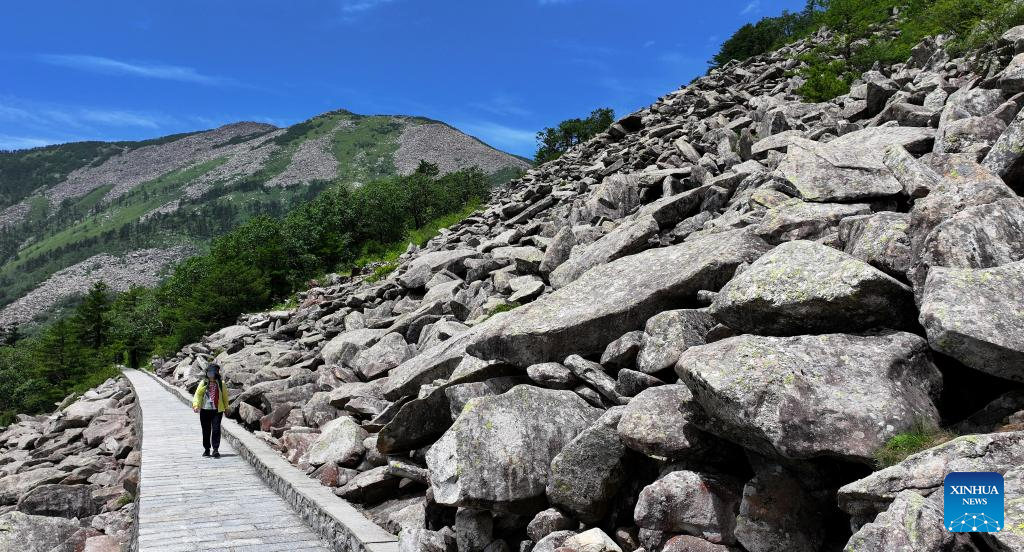 This aerial photo taken on July 21, 2023 shows visitors passing rock sea at the Zhuque National Forest Park in Xi'an, northwest China's Shaanxi Province. The park, located in the upper reaches of the east Laohe river and in the north of Qinling Mountains, covers an area of 2,621 hectares, and its highest point Bingjing peak has an altitude of 3,015 meters. Amazing scenery such as virgin forest, glacier remains and cloud sea can be seen along the road to the peak. (Xinhua/Liu Xiao)