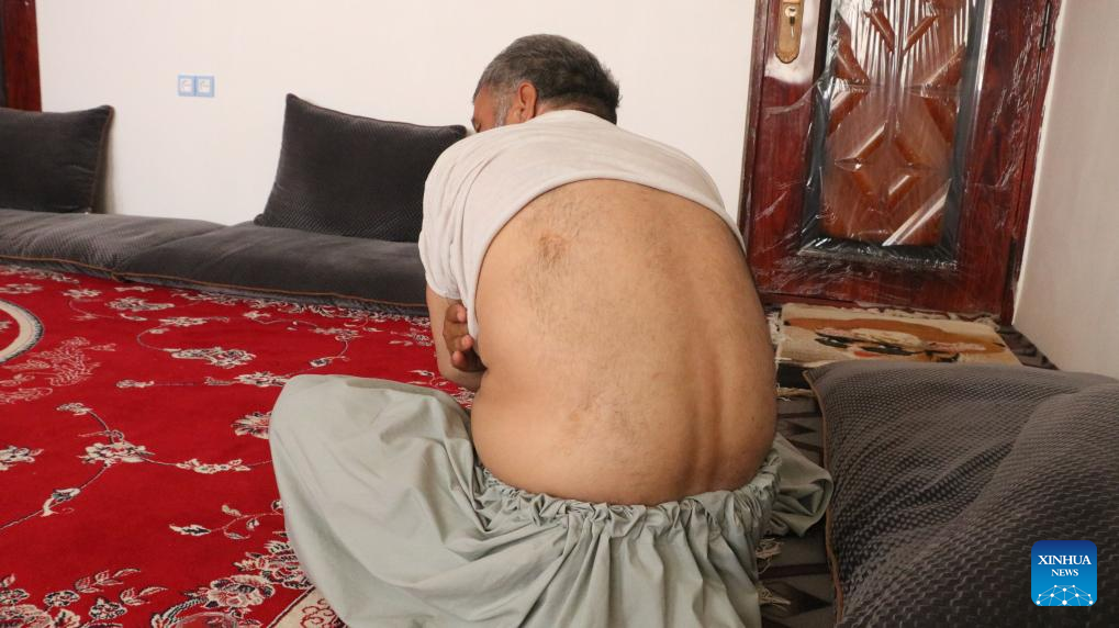 A man shows his back injury caused by an attack of U.S. cluster bombs in 2001, in Herat Province, Afghanistan, July 15, 2023. According to the Cluster Munition Coalition, from 2001 to 2002 the U.S. forces dropped 1,228 cluster bombs containing 248,056 bomblets in Afghanistan. (Photo by Mashal/Xinhua)