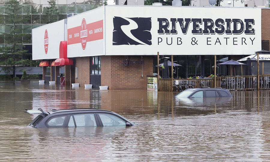 Cars are seen nearly submerged outside a restaurant in Bedford, Nova Scotia, Canada, on July 22, 2023. (Nova Scotia Government/Handout via Xinhua)