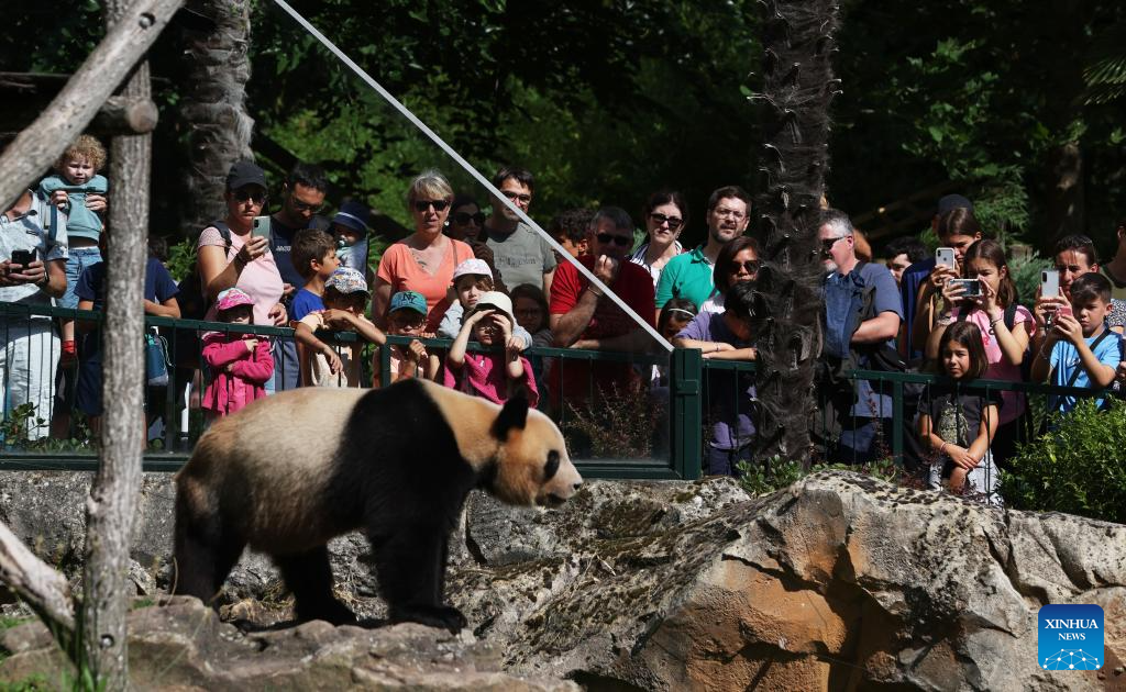 People watch the giant panda Yuan Meng at Beauval Zoo in Saint-Aignan, France, on July 24, 2023. Yuan Meng, the first giant panda born in France in 2017, will return to China on Tuesday. (Xinhua/Gao Jing)